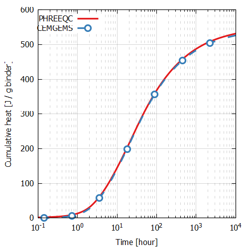 Figure 2 - Cumulative heat release under isothermal conditions during hydration of the simplified C3S-C4A system calculated with PHREEQC (solid lines) and CemGEMS (dashed lines with dots)