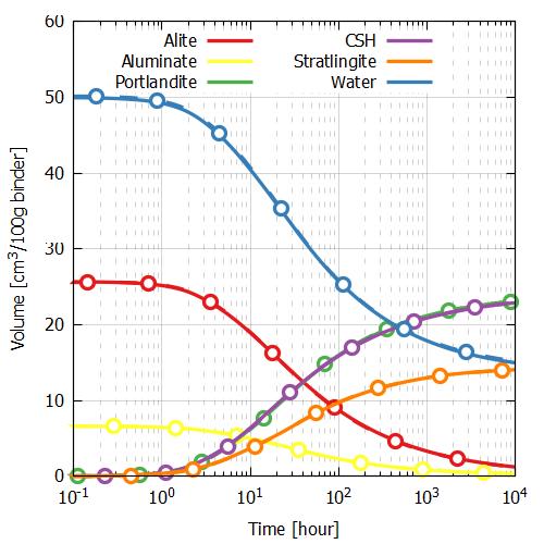 The simplified clinker system consists of 80 w% alite (C3S) and 20 w% aluminate (C4A) where C3S has 75 w% CaO and 25 w% SiO2 and C4A has 65 w% CaO and 35 w% Al2O3. The w/c ratio is 0.5.