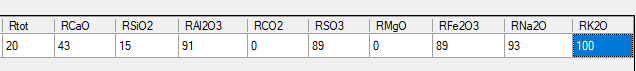 Oxide specific reactivity of K2O in percentage. The reactive weight percentage of the total oxide content is obtained by multiplying the weight percentage of each oxide with the oxide-specific reactivity. See Reactivity of SCMs. |