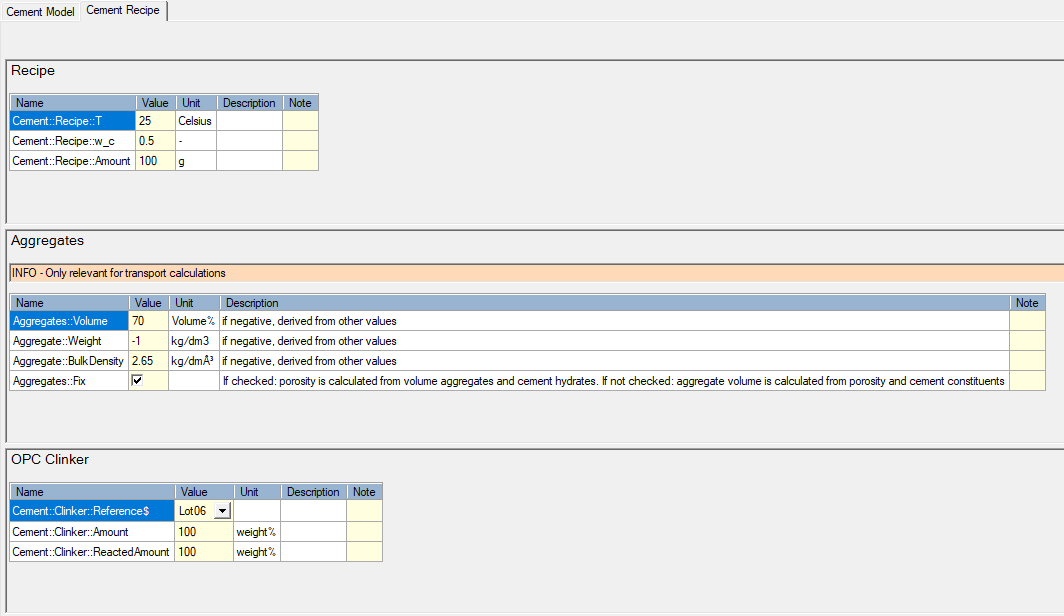 The group “Recipe” defines the temperature (°C), the water/cement ratio (-) and the amount of cement (g) (See Group - Recipe).