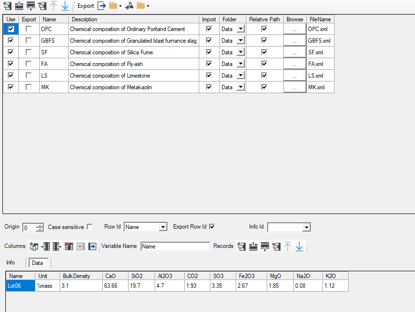 For each of the cement constituents (OPC and SCMs), a data table is available. In each of these data table, an oxide composition is given by default (see example for OPC). The indicator in the column Name is used in the dropdown list for the record "Cement::Clinker::Reference$" in the group "Cement::Clinker::Reference$". The reference to the oxide composition is listed in the Info tab. Other compositions can be added (See Tutorial - Adapt oxide composition of OPC clinker).