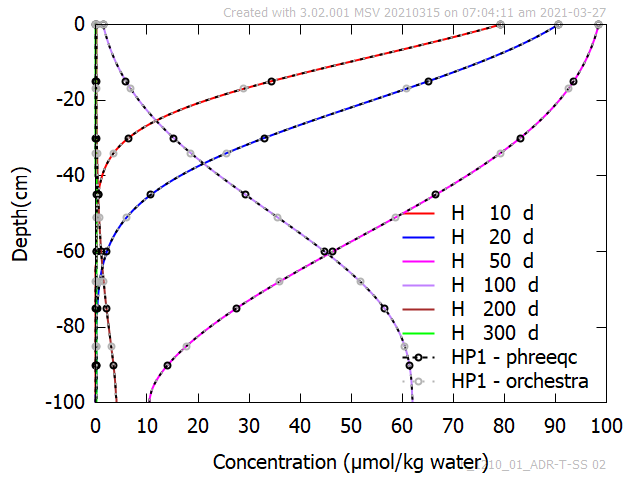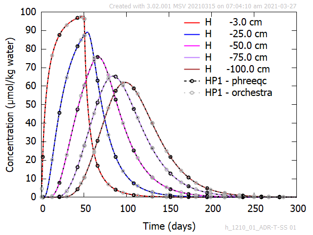 Figure 2 shows an excellent agreement between the tracer breakthrough curves obtained with HP1 and HYDRUS-1D for the evolution to the tracer concentration at selected depths.