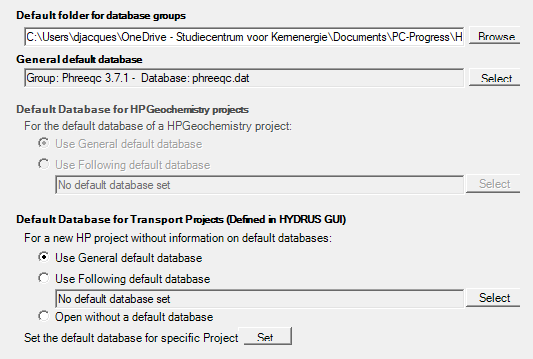 The project manager of the HYDRUS graphical user interface allows for defining project groups. The user can link a default database for new HP projects within a project group. Following options are availablew