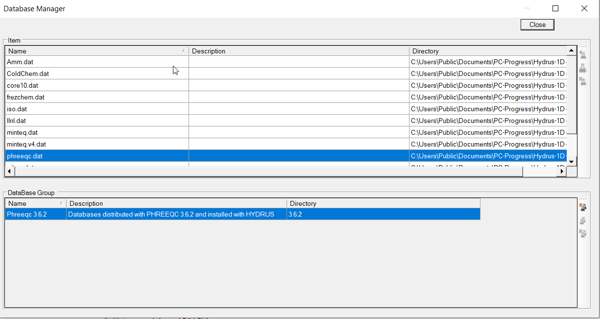 - a number of databases that comes from the same origin. In the screenshot below, the database group Phreeqc 3.6.2 groups all databases that are part from the Phreeqc 3.6.2 installation file. Note that this particular database group (or newer versions) are always part of the of HYDRUS 5.x installation.