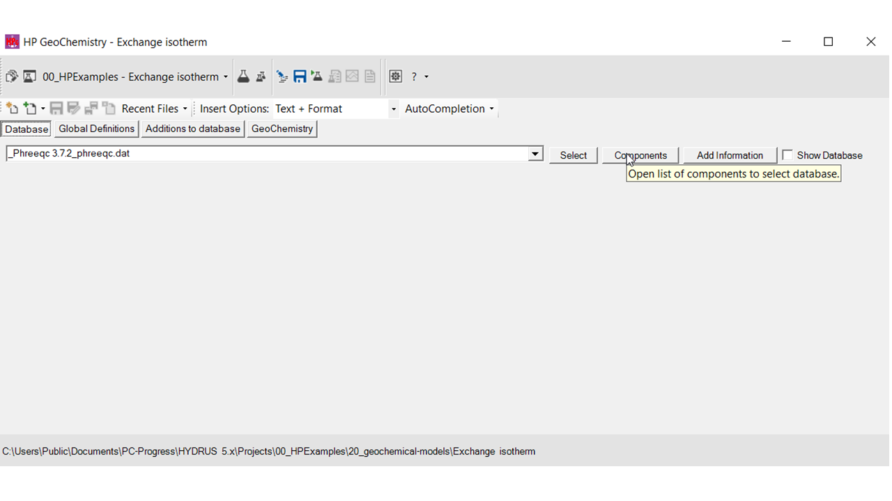 - Via HPGeochemistry: When a managed project is created, a project group is also created in HYDRUS 5.x. Default database are automatically set, but can be adapted.