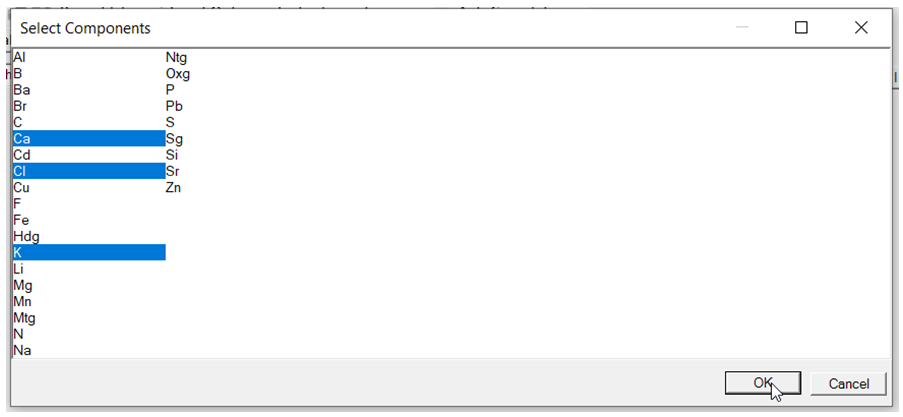 Click Components to select the aqueous components that are relevant for the simulation. The selection is used to construct the help trees.