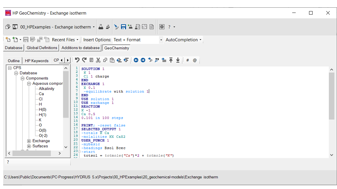 Selected_output 1 will create a file (Ca-K isotherm.out) with output variables of each step in the calculation of the isotherm (i.e. the 100 steps defined with REACTION).