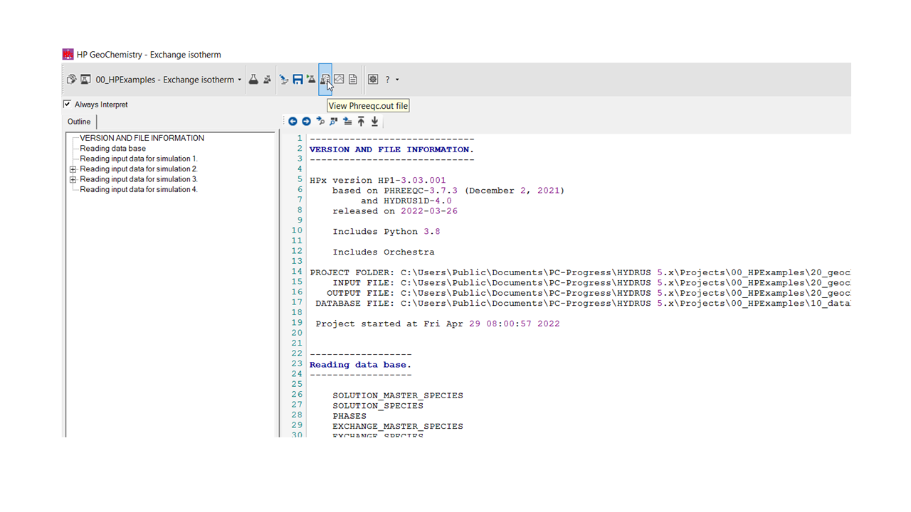 HPGeochemistry saves the input, and starts HPx.exe. A dos window opens, and the progress of simulation is shown (together with warnings and errors).