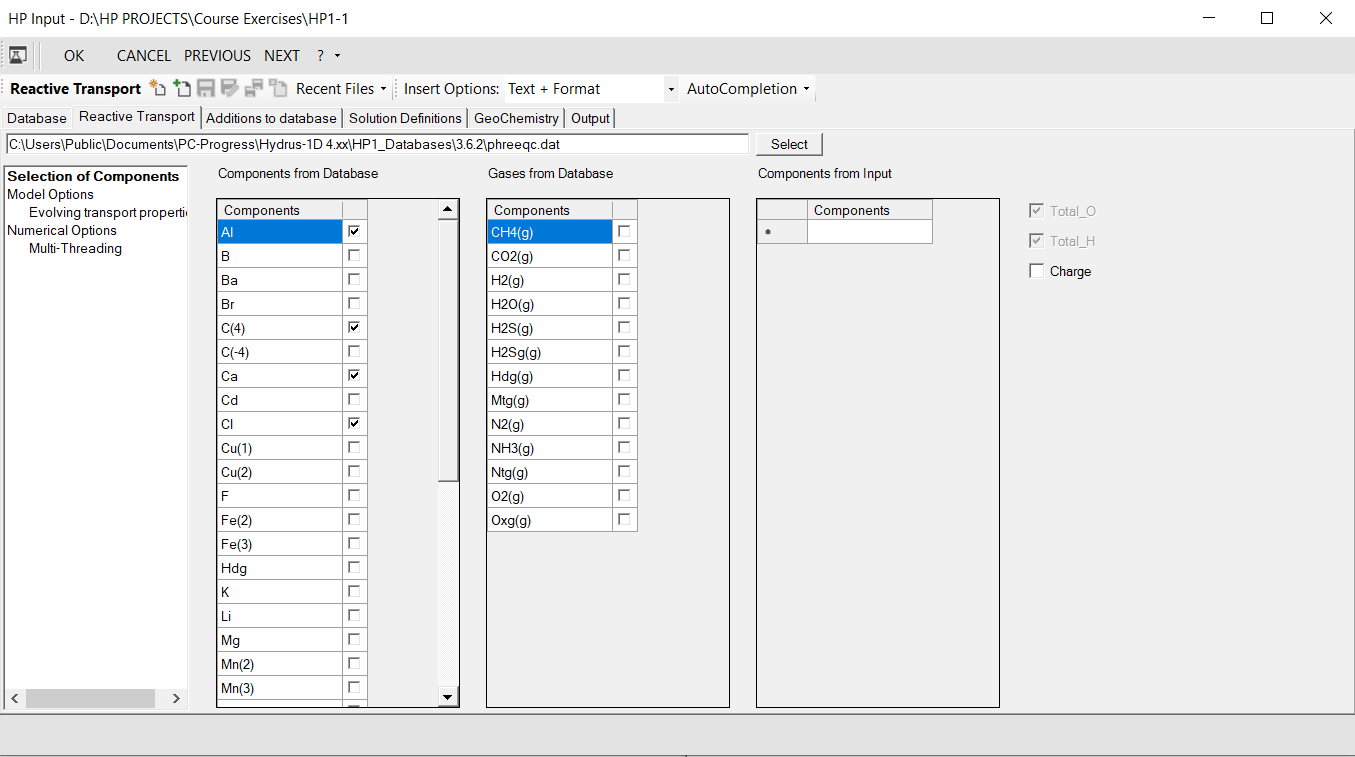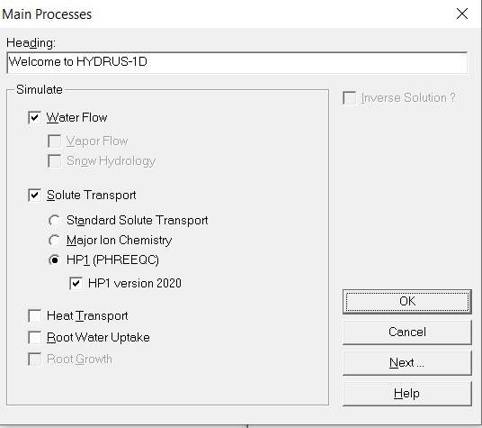 The dialogue window for creating input for the geochemical model formulation of reactive transport projects is started from the graphical user interface of HYDRUS. It is only available for HYDRUS projects that selected the HP1 version 2020 check box in the Main Processes dialogue window of the HYDRUS-1D GUI: