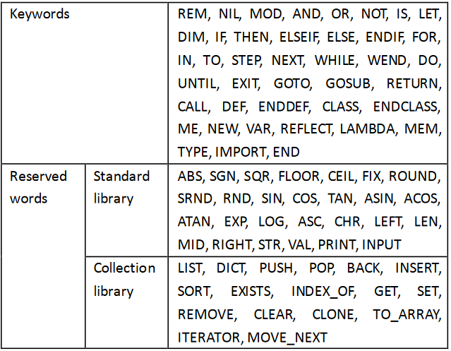Reserved words for MY-BASIC