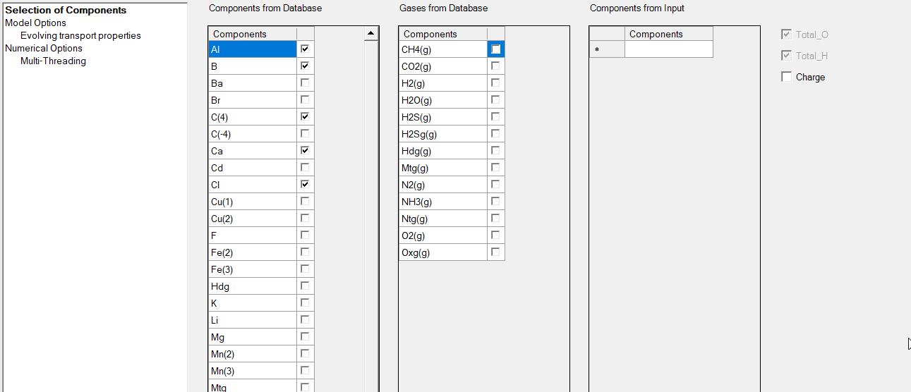 When Selection of Components is active in the option tree of the Reactive Transport tab, the user can select and define the components for the reactive transport project.